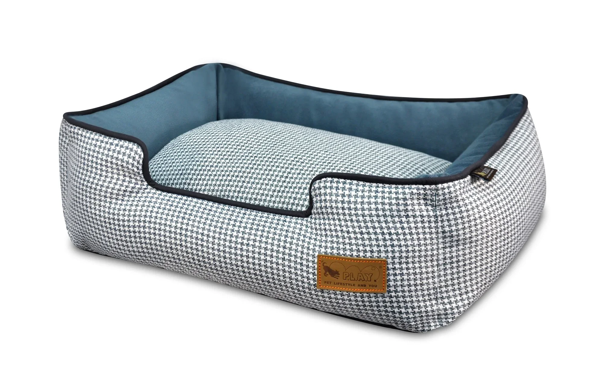 Keep your pup stylish and comfortable with this houndstooth dog bed, designed for elevated lounging and sophisticated snoozing. The timeless houndstooth pattern adds classic polish, while raised bolstered sides provide the perfect headrest for restful naps—at home or away.Crafted with furniture-grade construction, this bed features durable woven fabric, even basting stitching, a lead-free zipper, and a leather logo accent. Inside, it’s filled with high-loft PlanetFill®, made from 100% post-consumer recycled plastic bottles, offering plush support with an eco-conscious footprint.The removable, reversible center pillow makes cleaning easy, and the entire bed is machine washable and dryer friendly. Tested and approved for comfort and durability.